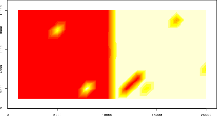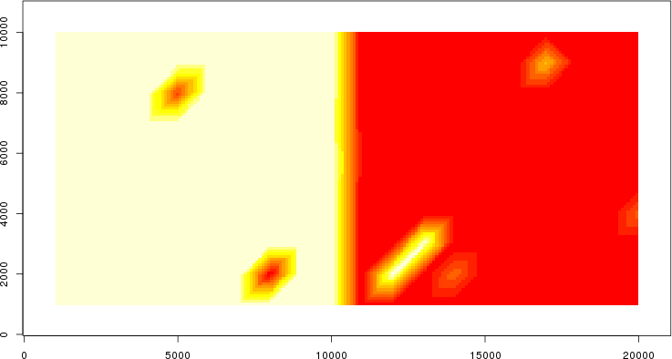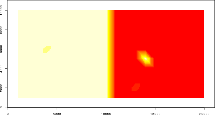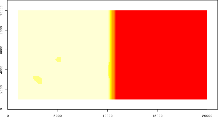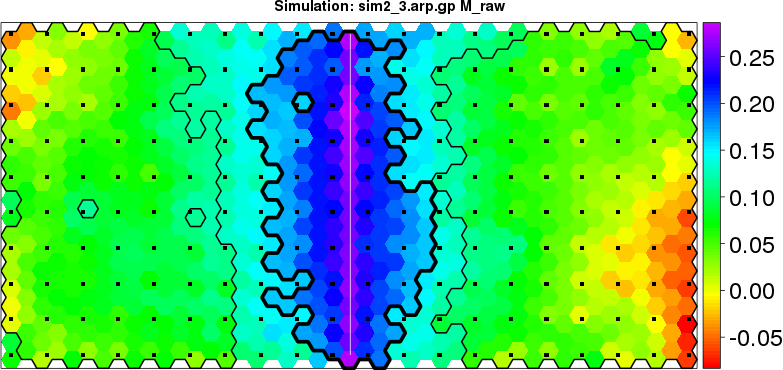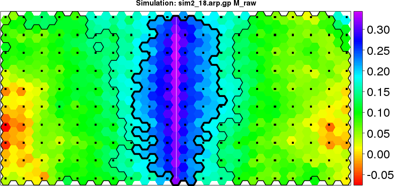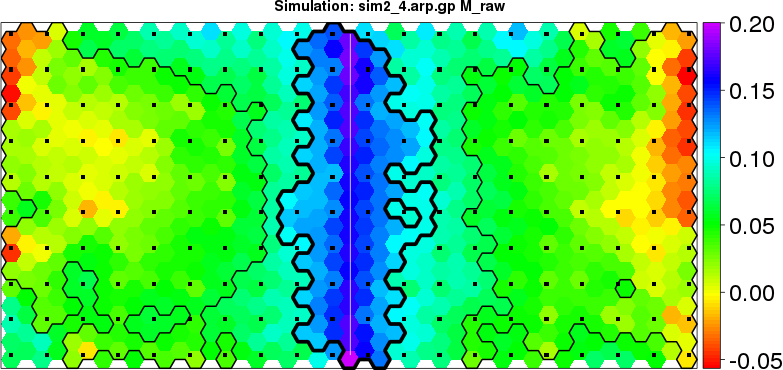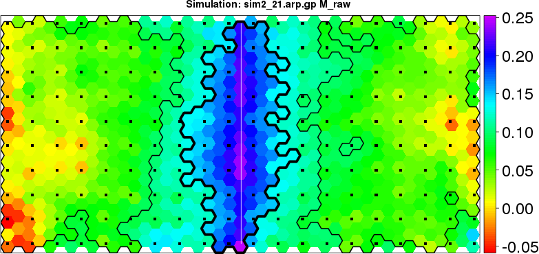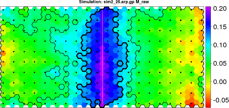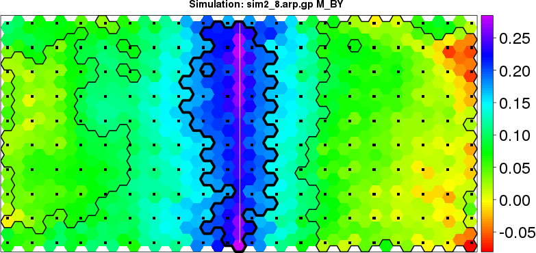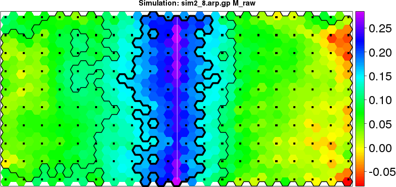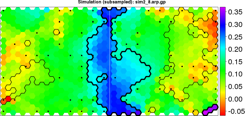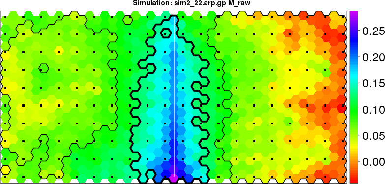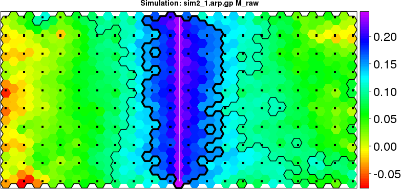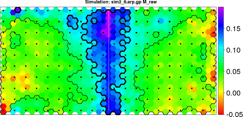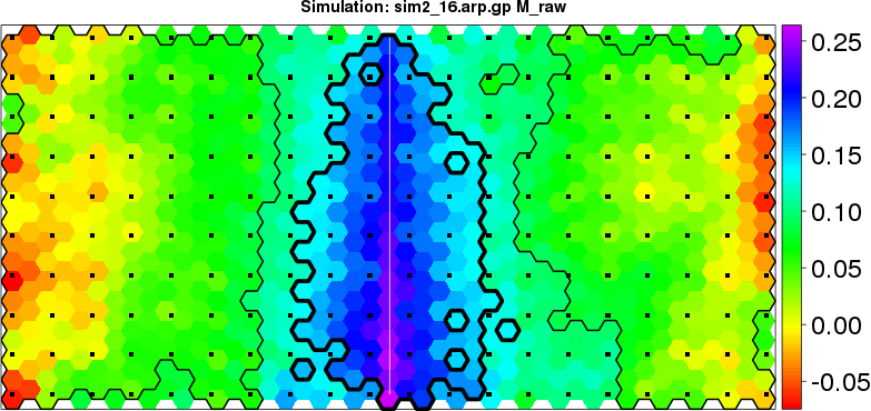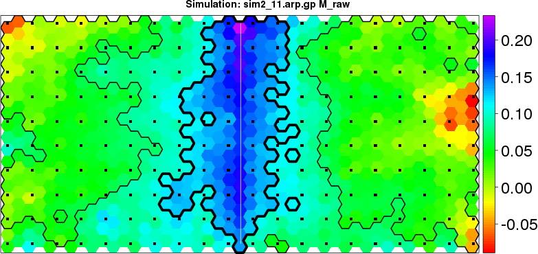 | Simulated data | Geographical plots of weighted mean of all ellipse values (i.e., individual genetic distances ar of Rousset 2000) and significant barrier (cells with differentiation values higher than expected under a random distribution (no FDR applied) are materialized with thick black borders) | Idem, Benjamini-Yekutieli FDR applied | MAPI analysis (no FDR applied) with subsampled (75/200) dataset | MAPI analysis (Benjamini-Yekutieli FDR applied) with subsampled (75/200) dataset | Best probability memberships | Probability memberships for cluster 1 | Probability memberships for cluster 2 | Probability memberships for cluster 3 | Probability memberships for cluster 4 | Probability memberships for cluster 5 | Best probability memberships | Probability memberships for cluster 1 | Probability memberships for cluster 2 | Probability memberships for cluster 3 | Probability memberships for cluster 4 | Probability memberships for cluster 5 | Scatter plot showing the first two components of the DAPC (when K*>2) or density plot showing the first principal component of the DAPC (when K*=2) | Probability memberships for cluster 1 | Probability memberships for cluster 2 | Probability memberships for cluster 3 | Probability memberships for cluster 4 | Probability memberships for cluster 5 | Scatter plot showing the first two components of the DAPC (when K*>2) or density plot showing the first principal component of the DAPC (when K*=2) | Probability memberships for cluster 1 | Probability memberships for cluster 2 | Probability memberships for cluster 3 | Probability memberships for cluster 4 | Probability memberships for cluster 5 |