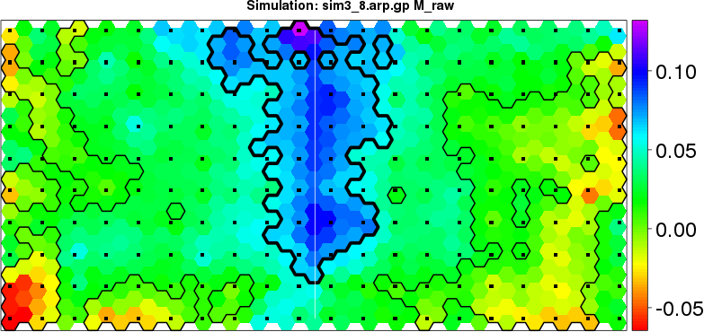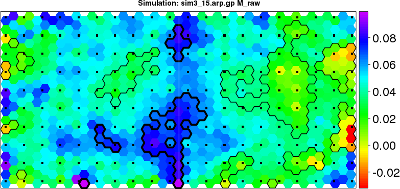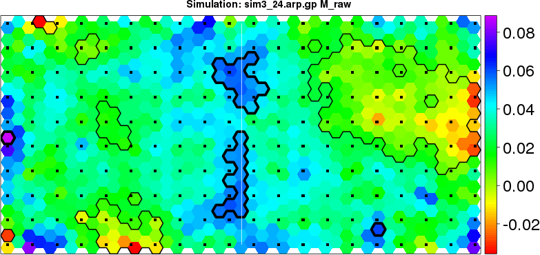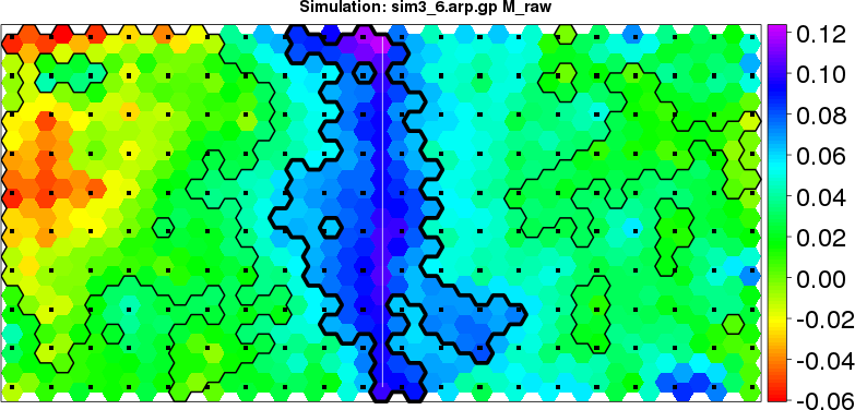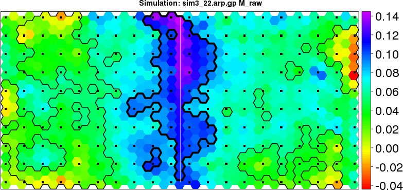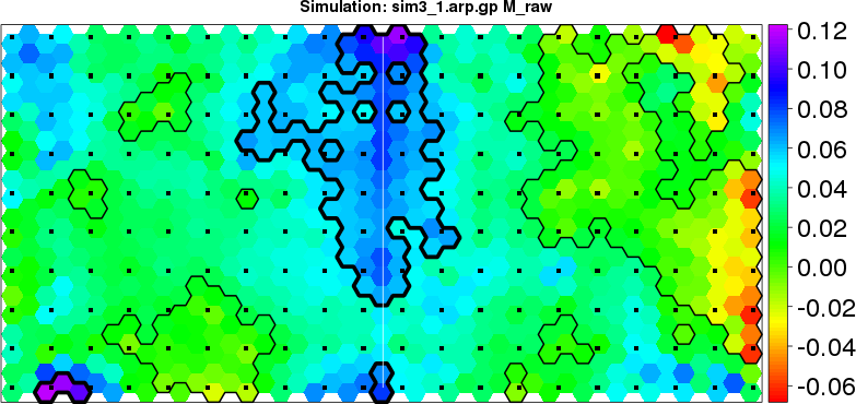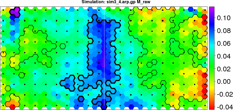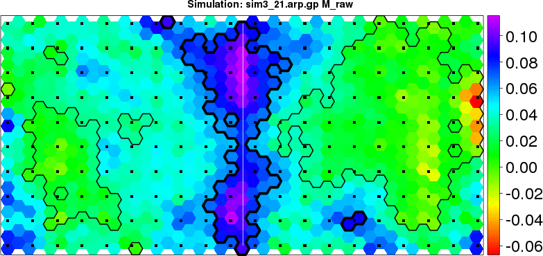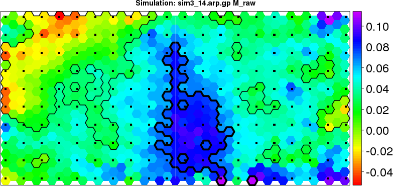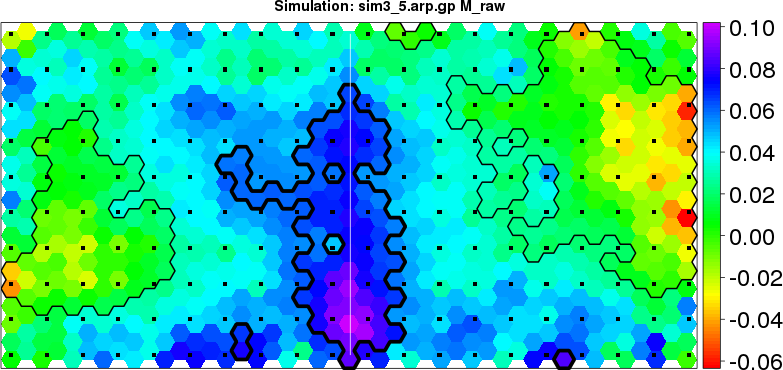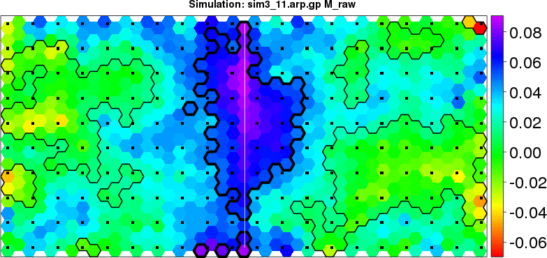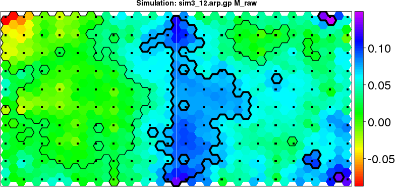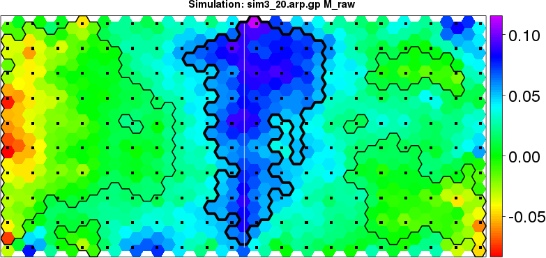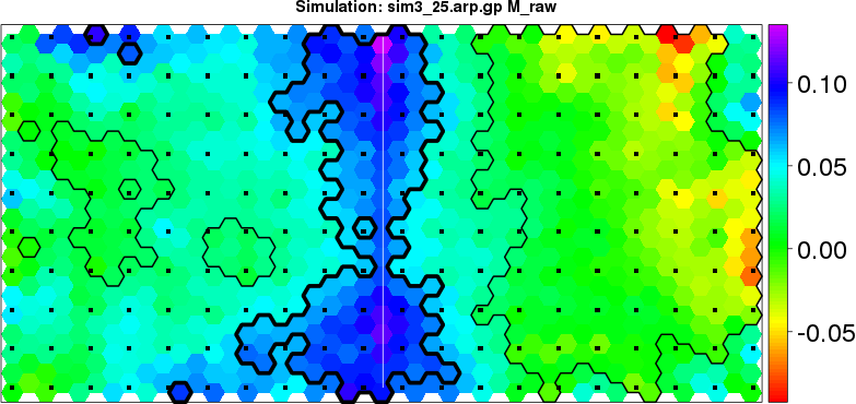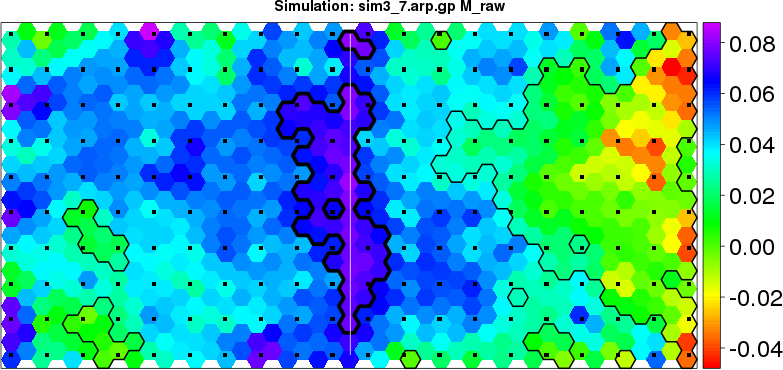 | Simulated data | Geographical plots of weighted mean of all ellipse values (i.e., individual genetic distances ar of Rousset 2000) and significant barrier (cells with differentiation values higher than expected under a random distribution (no FDR applied) are materialized with thick black borders) | Idem, Benjamini-Yekutieli FDR applied | MAPI analysis (no FDR applied) with subsampled (75/200) dataset | MAPI analysis (Benjamini-Yekutieli FDR applied) with subsampled (75/200) dataset | Best probability memberships | Probability memberships for cluster 1 | Probability memberships for cluster 2 | Probability memberships for cluster 3 | Probability memberships for cluster 4 | Probability memberships for cluster 5 | Best probability memberships | Probability memberships for cluster 1 | Probability memberships for cluster 2 | Probability memberships for cluster 3 | Probability memberships for cluster 4 | Probability memberships for cluster 5 | Scatter plot showing the first two components of the DAPC (when K*>2) or density plot showing the first principal component of the DAPC (when K*=2) | Probability memberships for cluster 1 | Probability memberships for cluster 2 | Probability memberships for cluster 3 | Probability memberships for cluster 4 | Probability memberships for cluster 5 | Scatter plot showing the first two components of the DAPC (when K*>2) or density plot showing the first principal component of the DAPC (when K*=2) | Probability memberships for cluster 1 | Probability memberships for cluster 2 | Probability memberships for cluster 3 | Probability memberships for cluster 4 | Probability memberships for cluster 5 |