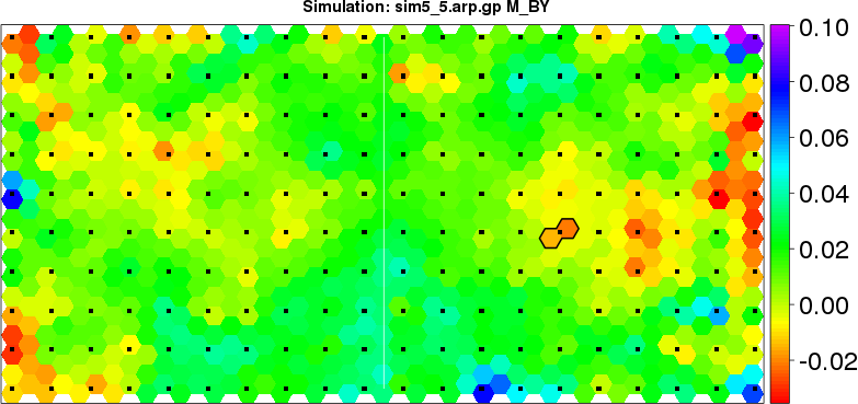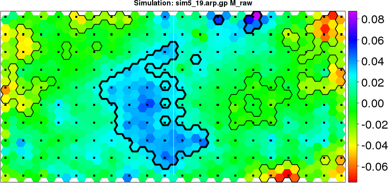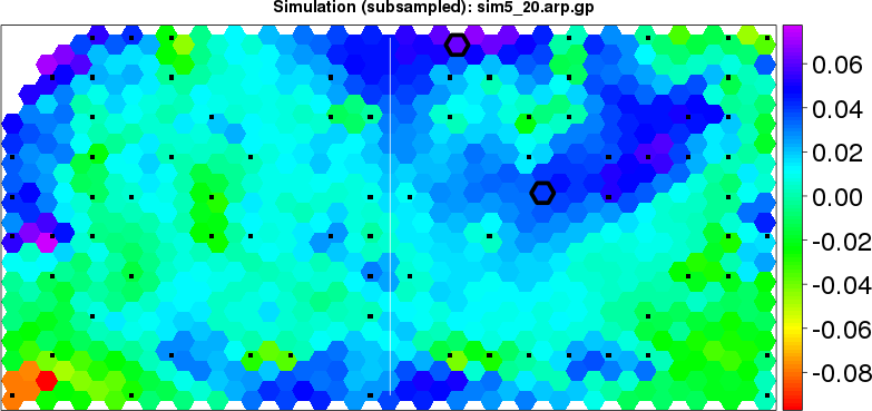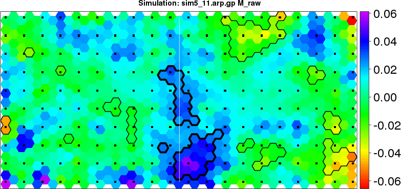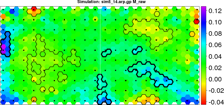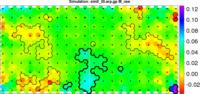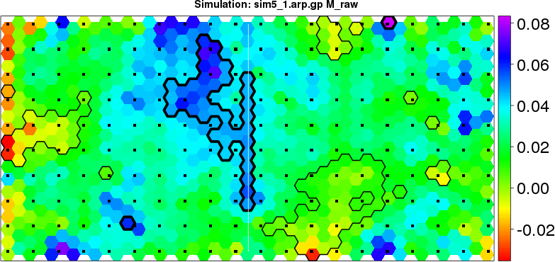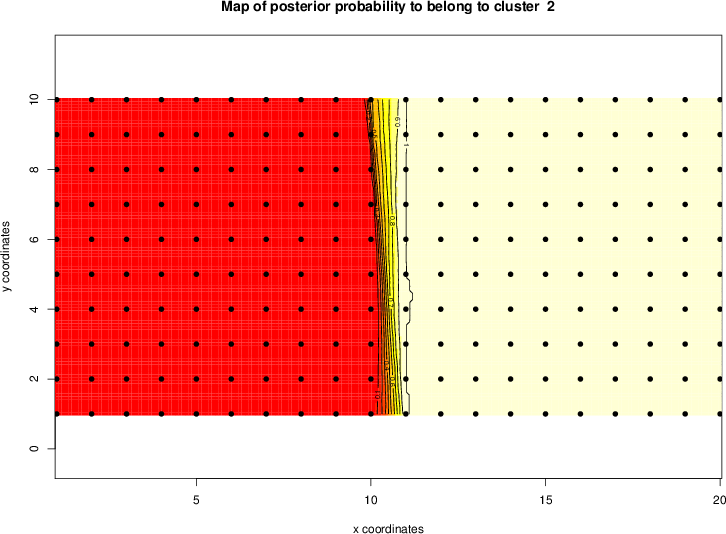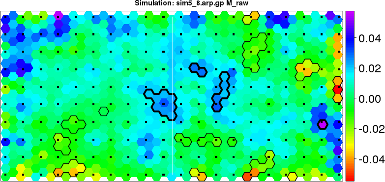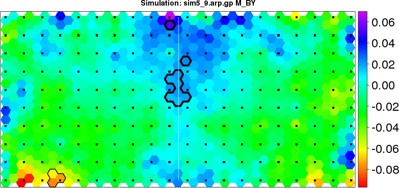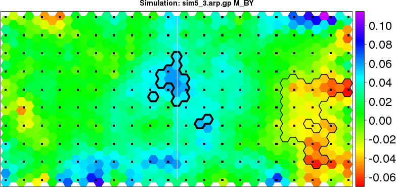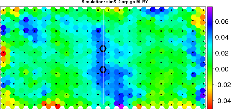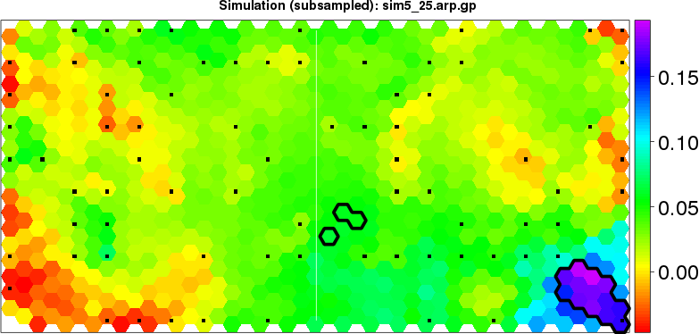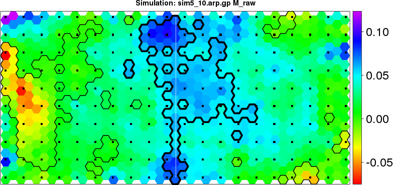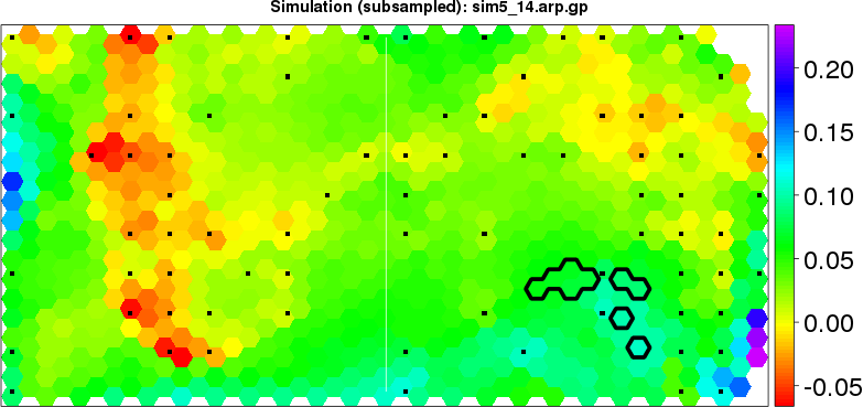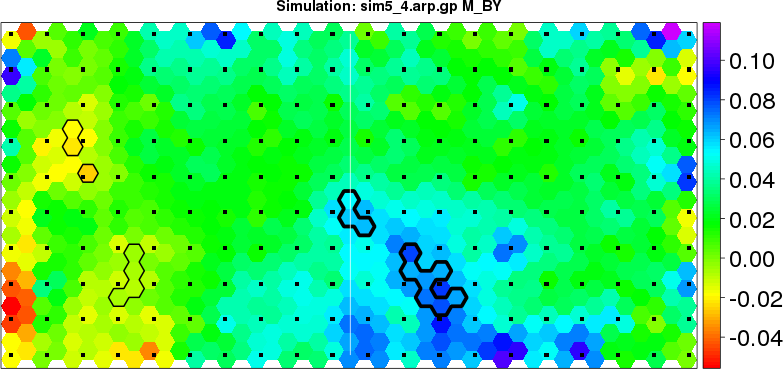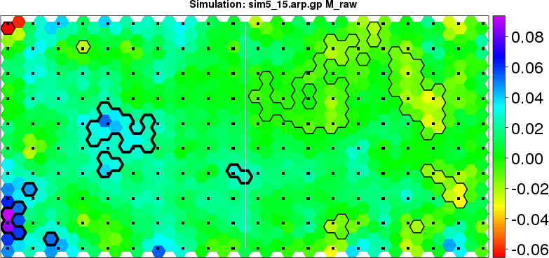 | Simulated data | Geographical plots of weighted mean of all ellipse values (i.e., individual genetic distances ar of Rousset 2000) and significant barrier (cells with differentiation values higher than expected under a random distribution (no FDR applied) are materialized with thick black borders) | Idem, Benjamini-Yekutieli FDR applied | MAPI analysis (no FDR applied) with subsampled (75/200) dataset | MAPI analysis (Benjamini-Yekutieli FDR applied) with subsampled (75/200) dataset | Best probability memberships | Probability memberships for cluster 1 | Probability memberships for cluster 2 | Probability memberships for cluster 3 | Probability memberships for cluster 4 | Probability memberships for cluster 5 | Best probability memberships | Probability memberships for cluster 1 | Probability memberships for cluster 2 | Probability memberships for cluster 3 | Probability memberships for cluster 4 | Probability memberships for cluster 5 | Scatter plot showing the first two components of the DAPC (when K*>2) or density plot showing the first principal component of the DAPC (when K*=2) | Probability memberships for cluster 1 | Probability memberships for cluster 2 | Probability memberships for cluster 3 | Probability memberships for cluster 4 | Probability memberships for cluster 5 | Scatter plot showing the first two components of the DAPC (when K*>2) or density plot showing the first principal component of the DAPC (when K*=2) | Probability memberships for cluster 1 | Probability memberships for cluster 2 | Probability memberships for cluster 3 | Probability memberships for cluster 4 | Probability memberships for cluster 5 |