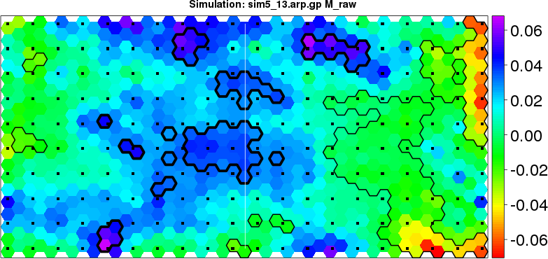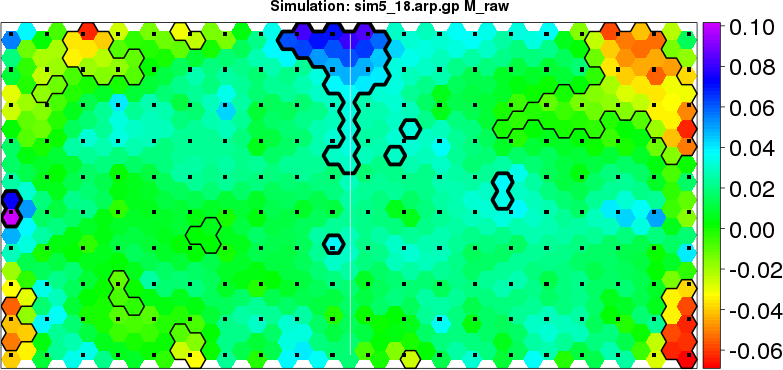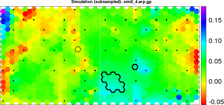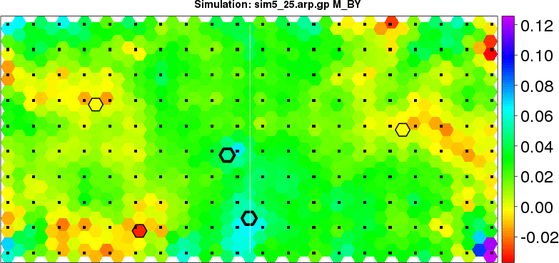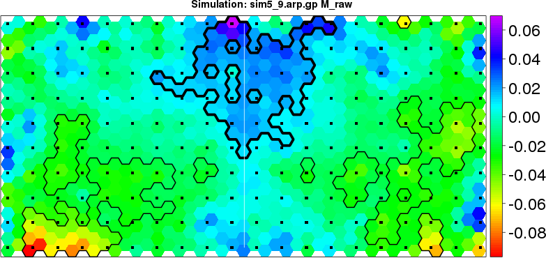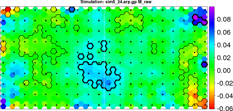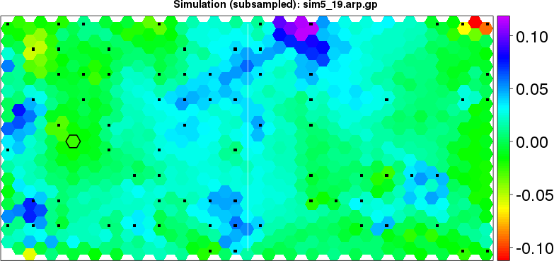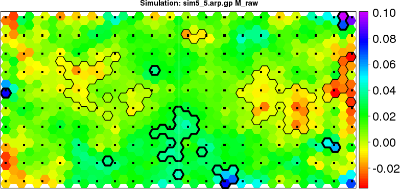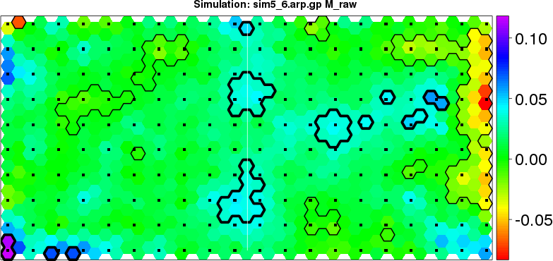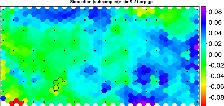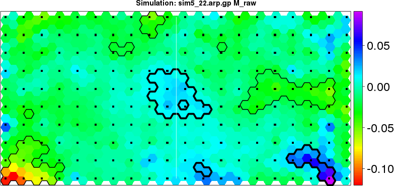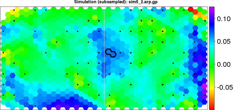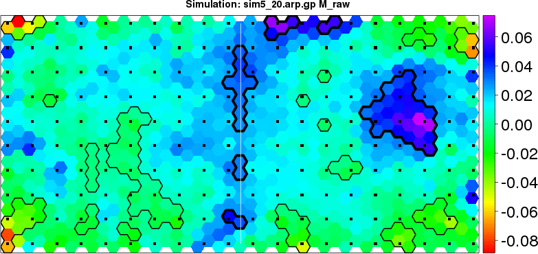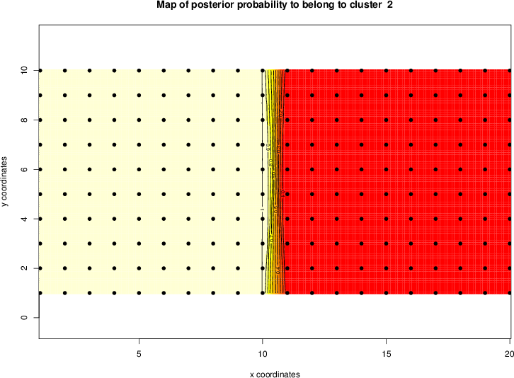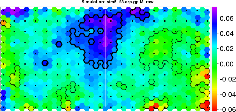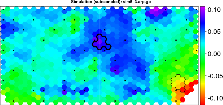 | Simulated data | Geographical plots of weighted mean of all ellipse values (i.e., individual genetic distances ar of Rousset 2000) and significant barrier (cells with differentiation values higher than expected under a random distribution (no FDR applied) are materialized with thick black borders) | Idem, Benjamini-Yekutieli FDR applied | MAPI analysis (no FDR applied) with subsampled (75/200) dataset | MAPI analysis (Benjamini-Yekutieli FDR applied) with subsampled (75/200) dataset | Best probability memberships | Probability memberships for cluster 1 | Probability memberships for cluster 2 | Probability memberships for cluster 3 | Probability memberships for cluster 4 | Probability memberships for cluster 5 | Best probability memberships | Probability memberships for cluster 1 | Probability memberships for cluster 2 | Probability memberships for cluster 3 | Probability memberships for cluster 4 | Probability memberships for cluster 5 | Scatter plot showing the first two components of the DAPC (when K*>2) or density plot showing the first principal component of the DAPC (when K*=2) | Probability memberships for cluster 1 | Probability memberships for cluster 2 | Probability memberships for cluster 3 | Probability memberships for cluster 4 | Probability memberships for cluster 5 | Scatter plot showing the first two components of the DAPC (when K*>2) or density plot showing the first principal component of the DAPC (when K*=2) | Probability memberships for cluster 1 | Probability memberships for cluster 2 | Probability memberships for cluster 3 | Probability memberships for cluster 4 | Probability memberships for cluster 5 |