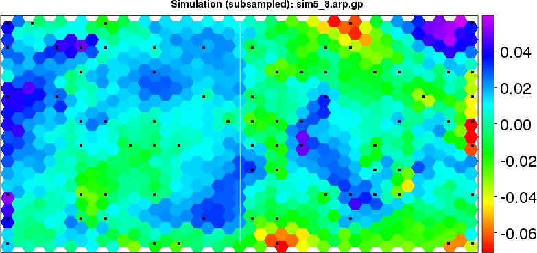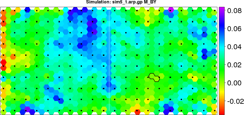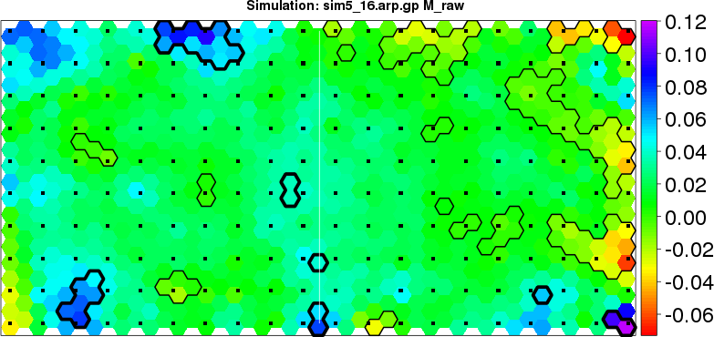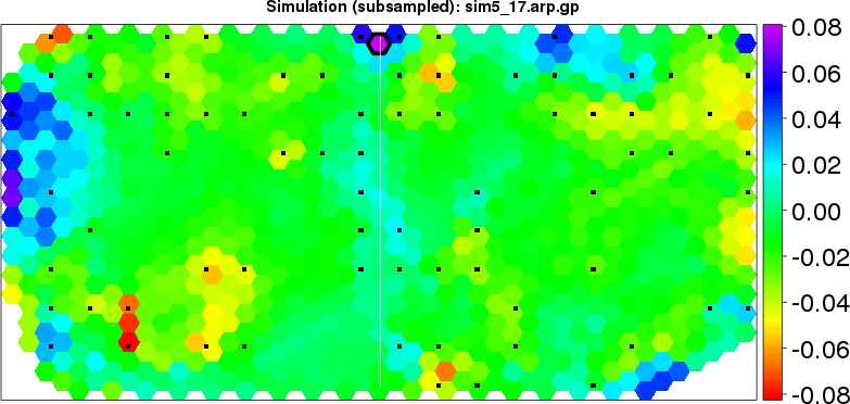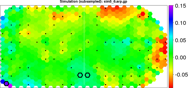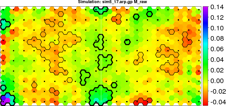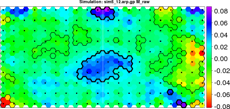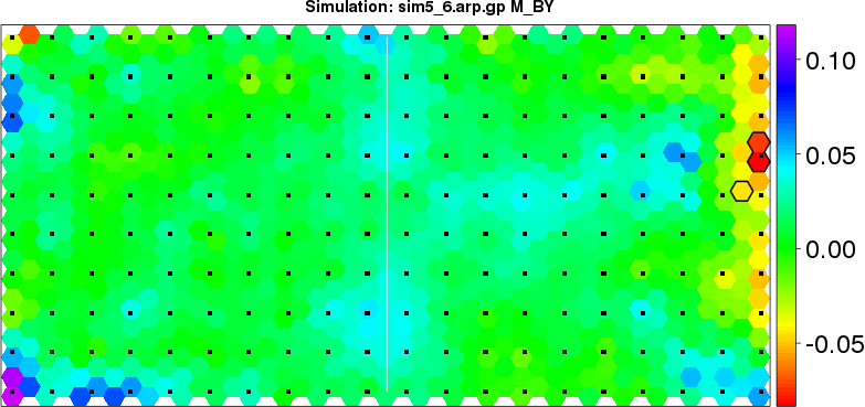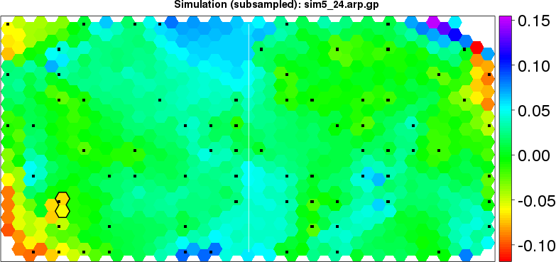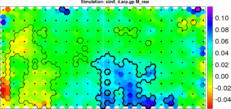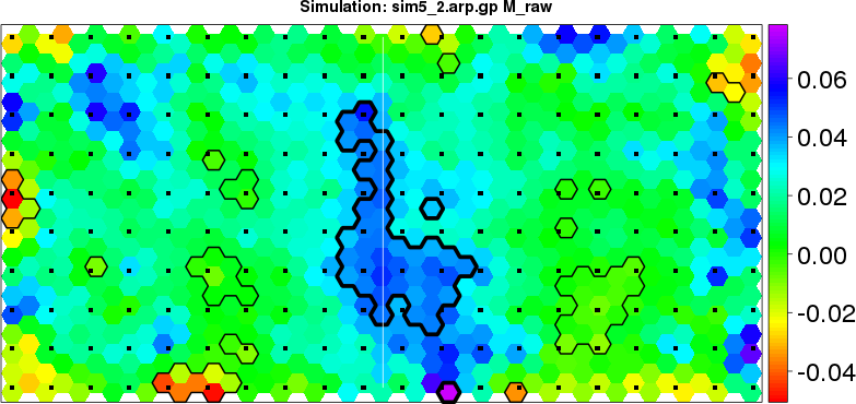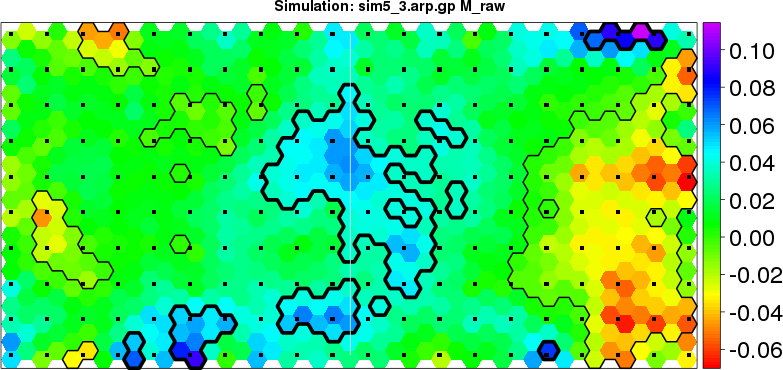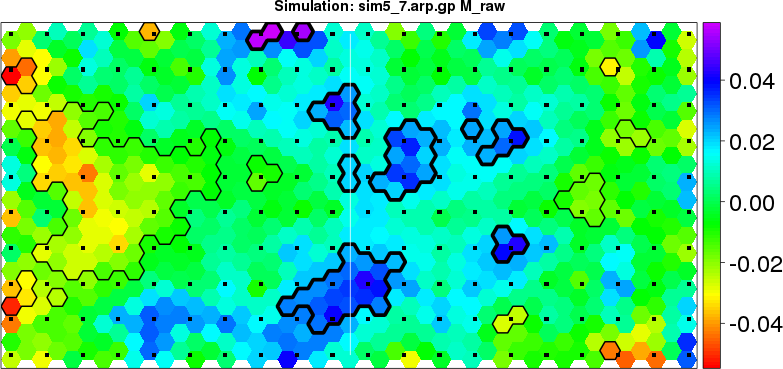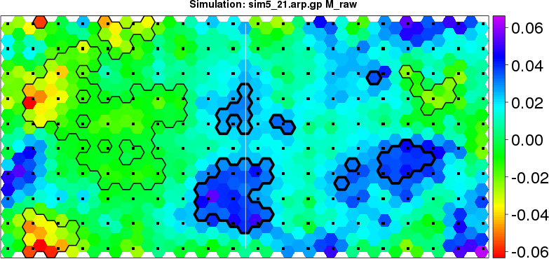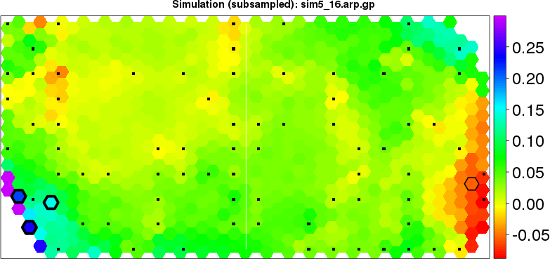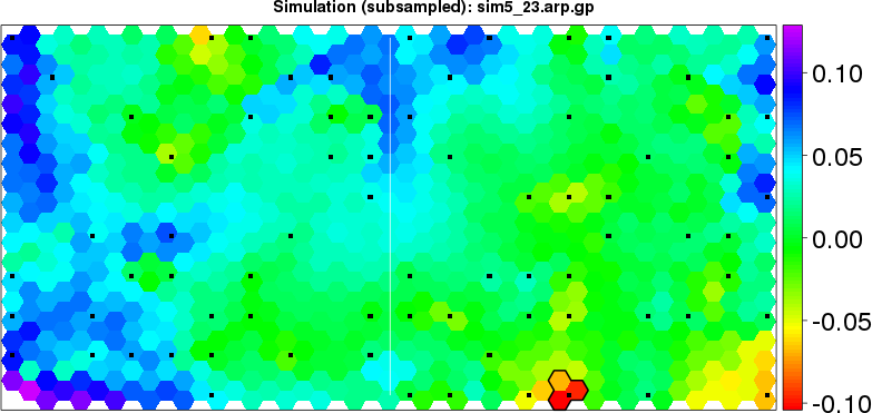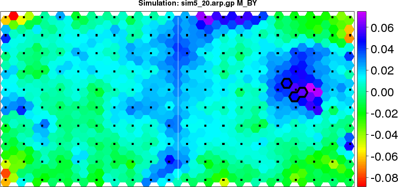 | Simulated data | Geographical plots of weighted mean of all ellipse values (i.e., individual genetic distances ar of Rousset 2000) and significant barrier (cells with differentiation values higher than expected under a random distribution (no FDR applied) are materialized with thick black borders) | Idem, Benjamini-Yekutieli FDR applied | MAPI analysis (no FDR applied) with subsampled (75/200) dataset | MAPI analysis (Benjamini-Yekutieli FDR applied) with subsampled (75/200) dataset | Best probability memberships | Probability memberships for cluster 1 | Probability memberships for cluster 2 | Probability memberships for cluster 3 | Probability memberships for cluster 4 | Probability memberships for cluster 5 | Best probability memberships | Probability memberships for cluster 1 | Probability memberships for cluster 2 | Probability memberships for cluster 3 | Probability memberships for cluster 4 | Probability memberships for cluster 5 | Scatter plot showing the first two components of the DAPC (when K*>2) or density plot showing the first principal component of the DAPC (when K*=2) | Probability memberships for cluster 1 | Probability memberships for cluster 2 | Probability memberships for cluster 3 | Probability memberships for cluster 4 | Probability memberships for cluster 5 | Scatter plot showing the first two components of the DAPC (when K*>2) or density plot showing the first principal component of the DAPC (when K*=2) | Probability memberships for cluster 1 | Probability memberships for cluster 2 | Probability memberships for cluster 3 | Probability memberships for cluster 4 | Probability memberships for cluster 5 |
